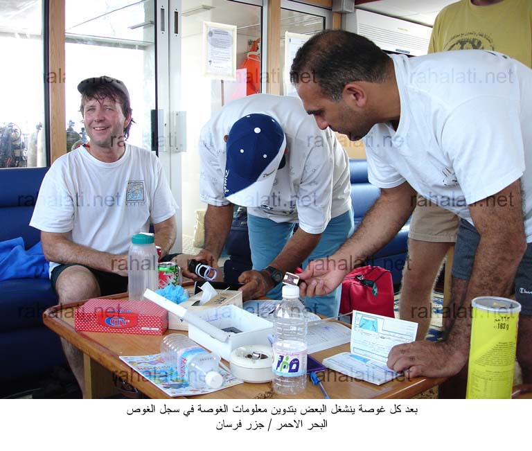 في أثناء الطريق الى الجزيرة يقوم منسق الغوص بأعطاء شرح موجز عن الجزيرة و خطة الغوص و توزيع الغواصين بحيث كل يعرف زميله في الغوص. بمجرد أن يصل المركب و يرمي مرساته يبدأ الغواصين بأعداد عدة الغوص و القفز في الماء.