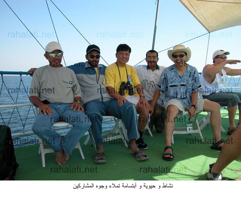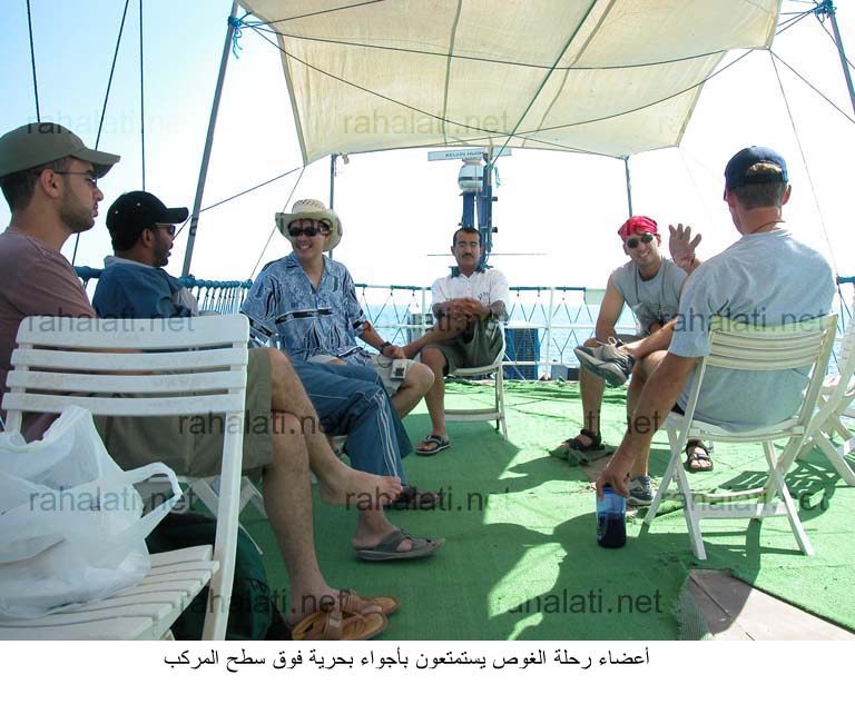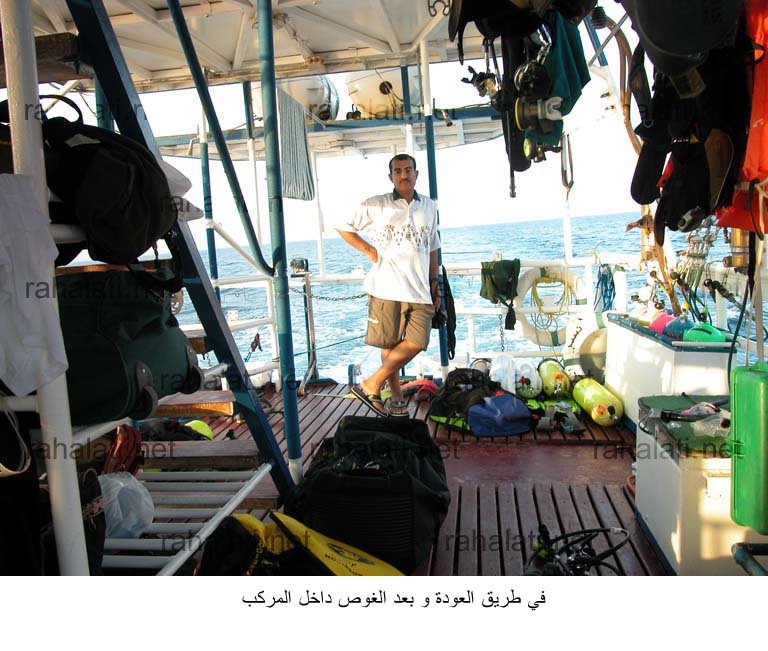 انطلقت الباخرة مباشرة بعد نقل الاغراض و انهاء جميع الامور اللوجستية بأتجاه المناطق المخطط لزيارتها من قبل فريق متعهد الرحلة الذي كان يضم مسئول غوص متخصص يقوم على الاشراف على الغواصين في نزولهم للماء و خروجهم منه.